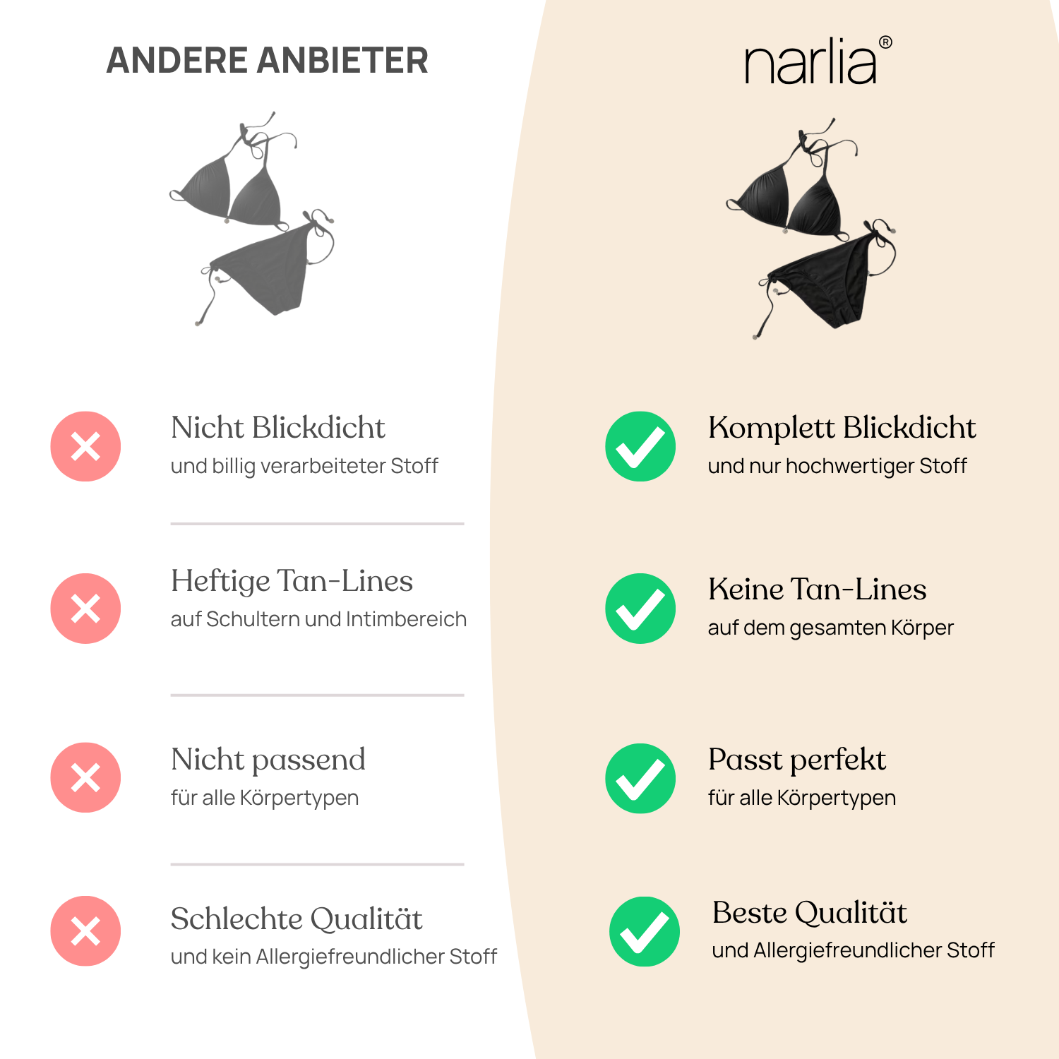 Nie wieder das klebrige, nasse Gefühl nach dem Schwimmen! Dank unserer innovativen Materialtechnologie trocknen Narlia-Badeanzüge bis zu 5× schneller als herkömmliche Bikinis. Raus aus dem Wasser – rein ins Sommerfeeling.